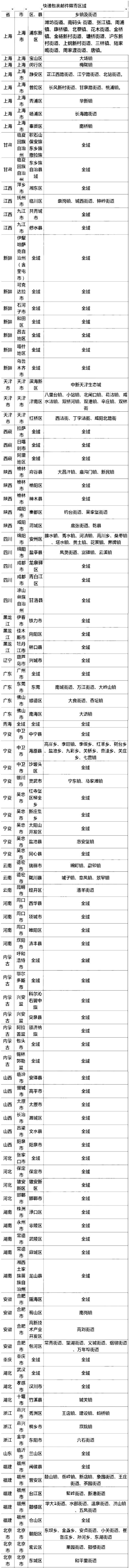 网传截至11月21日全国快递多区域限寄,涉及了上海、甘肃、江西、新疆、西藏、陕西、四川、黑龙江、广东、宁夏、云南等多个地区限制发件,甘肃嘉峪关、新疆石河子、西藏拉萨、黑龙江大庆、青海、内蒙古呼和浩特、湖北武汉等多个地区更是全域限寄,网友建议,关于山西省,湖北省,建议省外件尽量缓发,因为要经过同一处理中心,易被积压。