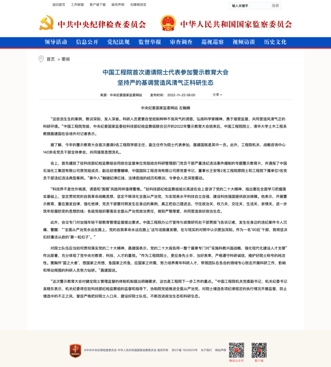 第一,这是中国工程院首次邀请院士代表参加警示教育大会。9名工程院学部主任、副主任作为院士代表参加。大会结束后,中国工程院院士、清华大学土木工程系教授聂建国表示,“这些活生生的案例,教训深刻、发人深省。科研人员更要自觉抵制种种不良风气的诱惑,弘扬科学家精神,勇于接受监督,共同营造风清气正的科研环境。”第二,会上通报了曹耀峰、王安2名工程院原院士违纪违法典型案例。报道显示,会议集体观看了《风腐一体坠深渊,心无敬畏终自毁》专题警示教育片,2名工程院原院士、中国石油化工集团有限公司原党组成员、副总经理曹耀峰和中国国际工程咨询有限公司原党委书记、董事长王安成为“案中人”,其触碰纪律红线、法律底线的经历和教训,让广大党员干部深受震动,引导大家以案为鉴、警钟长鸣。