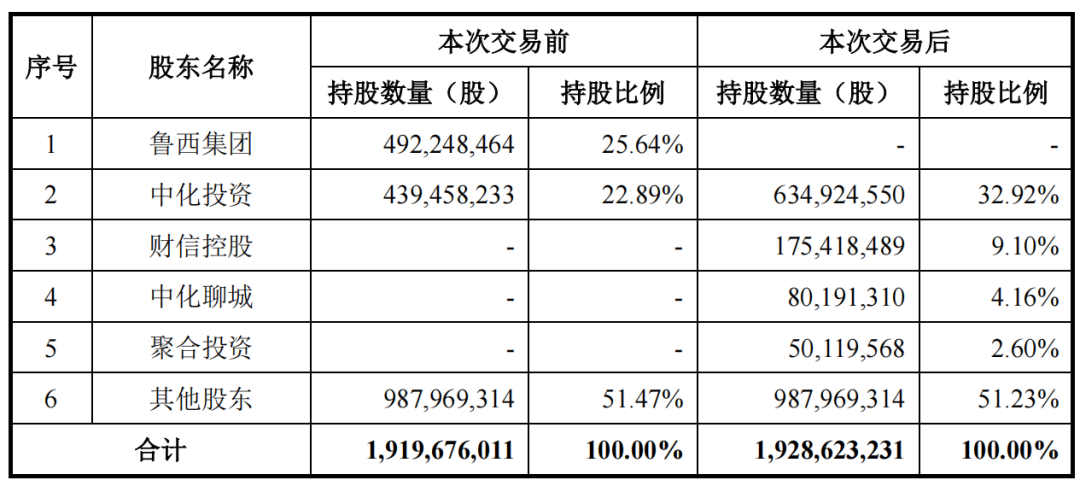 据悉,11月23日晚,鲁西化工公告,拟通过向鲁西集团的全部股东(中化投资、中化聊城、财信控股和聚合投资)发行股份的方式对鲁西集团实施100%股权的吸收合并。鲁西化工于1998年 6 月上市。在合并之前,中国中化为该公司的实际控制人,在吸收合并后,中化投资合计占比36.78%。鲁西集团,全名为鲁西集团有限公司,由四位股东组成,中化投资发展有限公司占股39%、聊城市财信投资控股集团有限公司占股35%、中化投资(聊城)有限公司占股16%、聊城市聚合股权投资有限公司占股10%,背后实际控股方为中国中化集团。本次交易完成后,鲁西化工为存续方,将承继及承接鲁西集团的全部资产、负债、人员、业务、合同及其他一切权利与义务,鲁西集团将注销法人资格,鲁西集团持有的上市公司492,248,464股股票将被注销,中化投资、中化聊城、财信控股和聚合投资将直接持有以标的资产认购取得的上市公司股票。经各方协商确定鲁西集团100%股权的最终交易价格为63.95亿元。本次交易前,鲁西化工的主营业务为化工新材料、基础化工、化肥产品及其他业务。鲁西集团系持股型公司,除了持有鲁西化工股份以外,不直接从事其他鲁西化工吸收合并鲁西集团暨关联交易之独立财务顾问报告24具体的生产经营业务。本次交易完成后,上市公司将承继及承接鲁西集团的全部资产、负债、人员、业务、合同及其他一切权利与义务。鲁西化工是国内综合性化工企业龙头之一,主要产品涉及化工新材料、基础化工产品、肥料产品等领域,其中化工新材料产品主要包括聚碳酸酯、尼龙 6、己内酰胺、多元醇等。