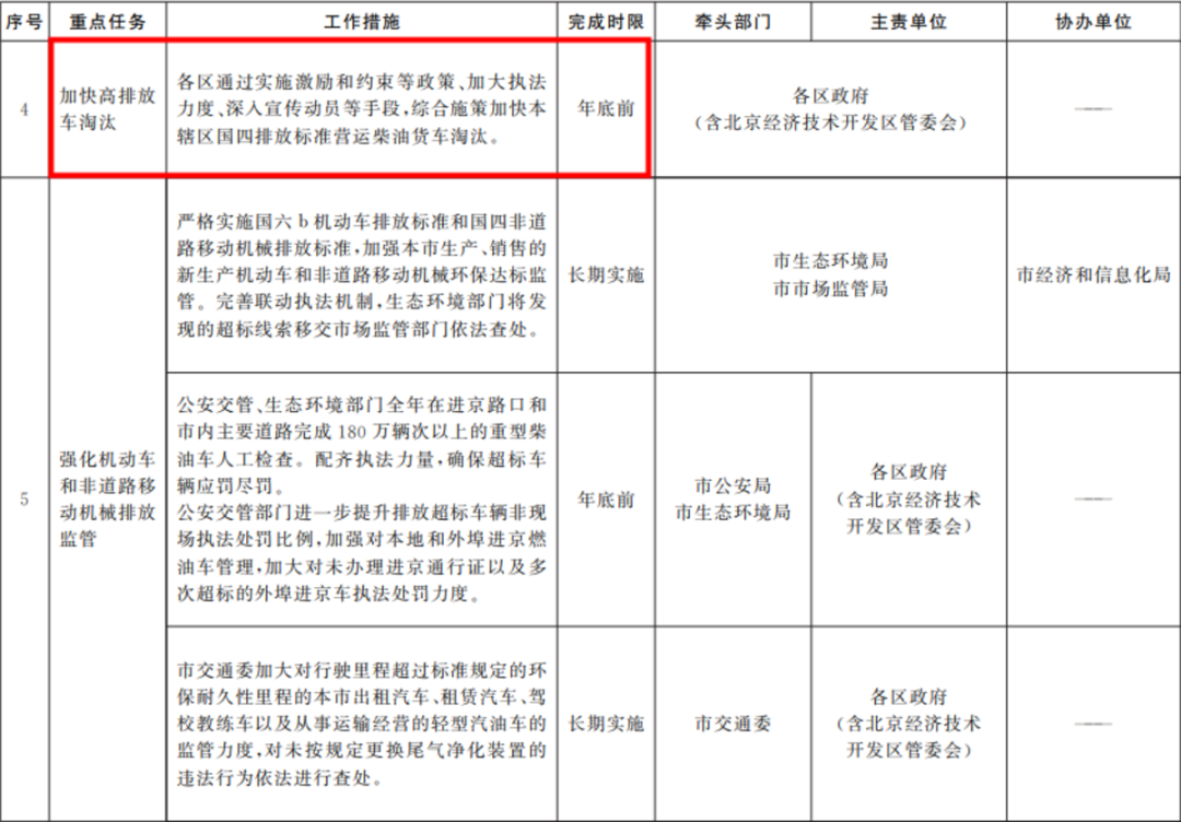 另外,通知要求,北京市各区通过实施激励和约束等政策、加大执法 力度、深入宣传动员等手段,综合施策加快本辖区国四排放标准营运柴油货车淘汰。