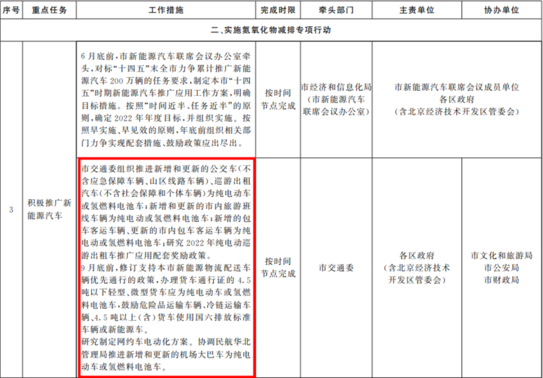 2022年3月,北京市人民政府办公厅关于印发《北京市深入打好污染防治攻坚战2022年行动计划》的通知,通知针对国四淘汰和新能源汽车推广做出部署。