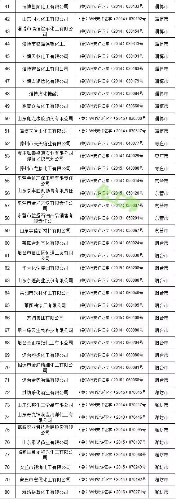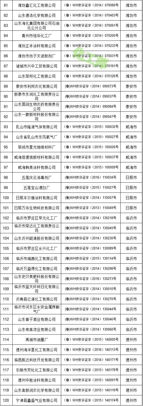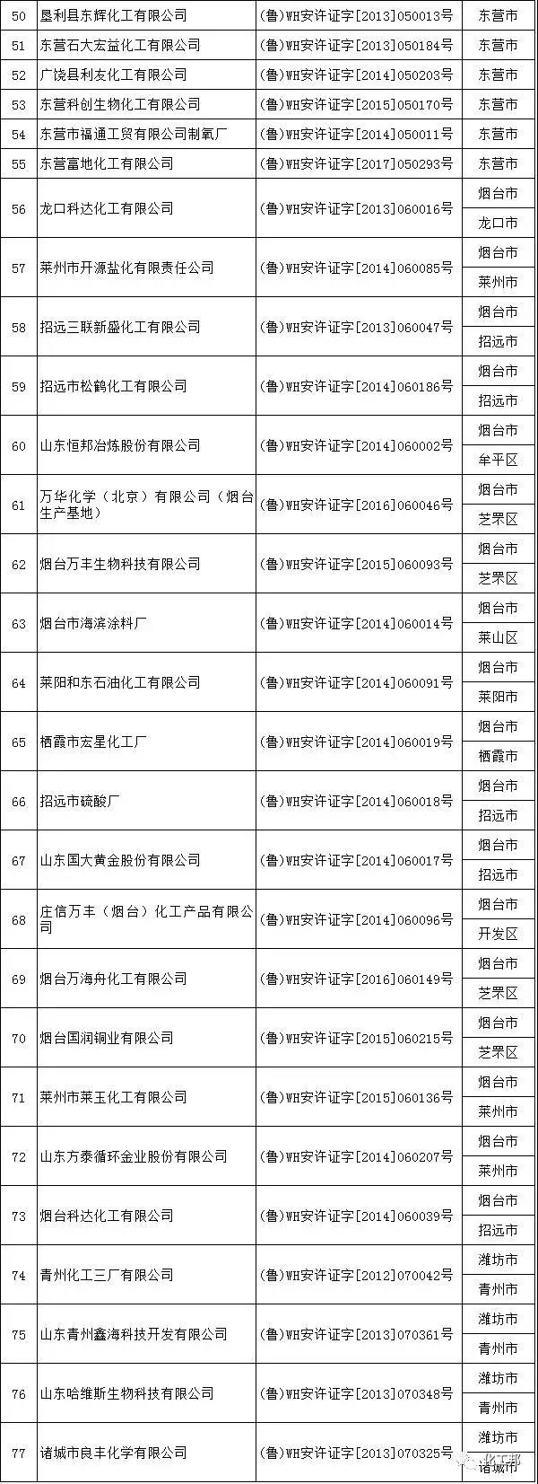 2017年上半年山东全省危险化学品生产企业安全生产许可证注销名单(169家)