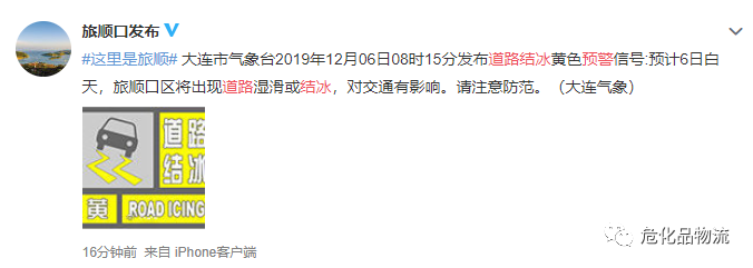 大连市气象台2019年12月06日08时15分发布道路结冰黄色预警信号:预计6日白天,旅顺口区将出现道路湿滑或结冰,对交通有影响。请注意防范。(大连气象)