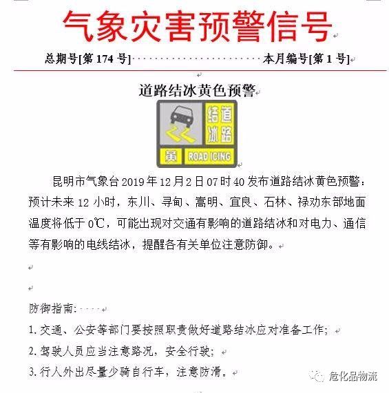 12月4日16时25分,昆明发布道路结冰黄色预警,昆明主城区、禄劝、富民、寻甸、嵩明、晋宁、安宁、宜良、石林、东川夜间最低气温将低于2℃,部分高海拔地区地面温度将低于0℃,可能出现对交通有影响的道路结冰和对电力、通信等有影响的电线结冰,提醒各有关单位注意防御。随后,官渡区、西山区、五华区等相继发布道路结冰黄色预警……