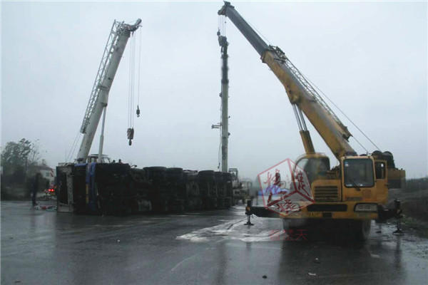 根据现场情况,消防官兵一方面实行交通管制,一方面用生石灰对泄漏出来的浓硫酸进行化学中和,对已经流失的硫酸进行拦截。同时,调派三辆吊车对槽罐车进行起吊。