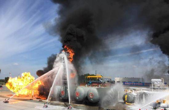 8月23日,第二届全国危险化学品救援技术竞赛在黑龙江省大庆市中石油大庆油田公司正式拉开帷幕。履带车式机器人、三相射流技术装备、新型灭火剂、大流量消防炮等这些新技术、新装备纷纷亮相,在竞赛前的大庆油田石油化工火灾事故处置综合实战演练上,首次联合运用。图为履带车式机器人进行灭火救援。