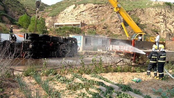 7月4日11时56分,延安志丹消防中队接警称:旦八镇往永宁方向约15公里处,一辆液化天然气槽车发生侧翻。