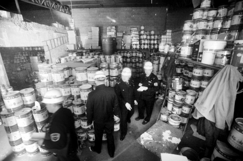 库房的两扇门紧锁,透过门缝可以看见其中一扇门后堆满了油漆桶。执法人员联系负责人,对方说在外地。近半小时后,执法人员在仓库附近找到了货车司机,司机交出一把钥匙,终于打开了仓库的大门。
