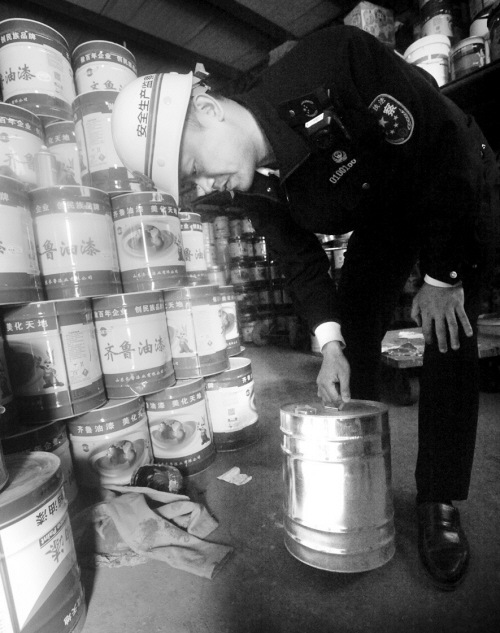 昨日,市安监局执法监察支队联合市公安局经保分局突击检查了于洪区微山湖街一处仓库,现场查出11000桶50余吨、价值300多万元的油漆及稀释剂等危险化学品。