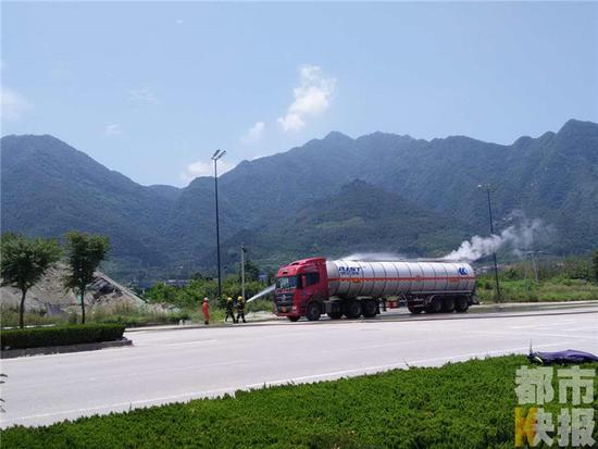 7月27日上午九点钟左右,西安市环山路秦岭大道户县草堂段,一辆装有过氧化氢(俗称双氧水)的罐车发生泄漏,情况危急。 记者赶到现场,了解到罐车发生泄漏之后,司机赶紧拨打了救援电话。消防员迅速赶赴现场进行处理。 由于夏日高温,过氧化氢又是一种极易挥发的气体,现场救援十分危急。经过消防官兵的努力,罐体温度仍然保持在92摄氏度左右,随时有发生爆炸的可能。 目前,高新安检部门已经请来了专家,对罐车内添加了稳定剂,爆炸危险初步排除。
