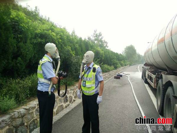 8时15分,大队事故处理民警到达现场。现场空气中弥漫着强烈的刺激性气味,为查明危化品泄露情况同时保障现场处置民警的安全,经对危化品运输车驾乘人员进行简单询问后,民警了解到所运危化品为苯酚,其危险性为有毒,对皮肤有腐蚀性,遇明火、高热或与氧化剂接触,有引起燃烧爆炸的危险。在佩戴防毒面具的情况下,民警深入事故中心现场进行了简单勘查。经查,发现引起泄露的原因是危化品槽罐车尾部卸料口因遭受撞击断裂,同时该车紧急切断装置也位于该位置,遭受撞击后无法使用。经大队民警与先期抵达的阳城县消防大队共同协作,现场险情基本得到控制。
