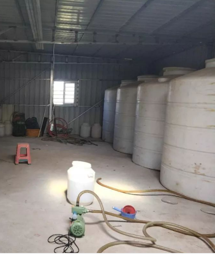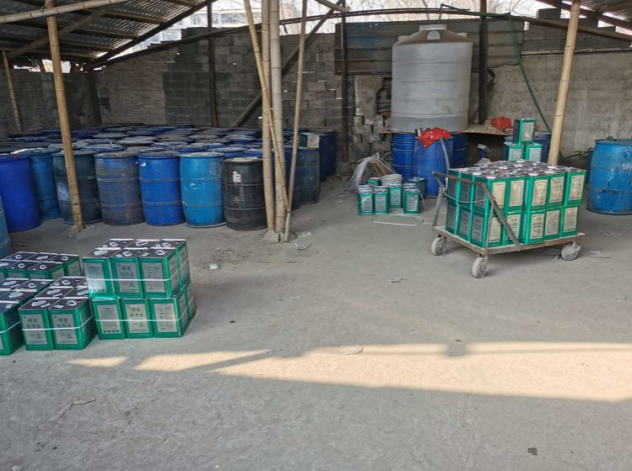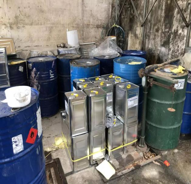 (二)发现使用无标签、无商标、无产品说明的各种铁桶、塑料桶、钢瓶等进行存放。