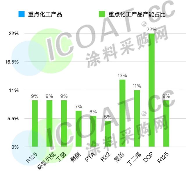 在塑化剂、石化、氟化工、涂料等细分领域,广东表现亮眼,其中重点化工品产能占比分别为,DOP(22%)、氨纶(13%)、丁二烯(11%)、R125(9%)、环氧丙烷(9%)、丁酯 (9%)、聚醚(7%)、PTA(6%)、 R32(5%)。